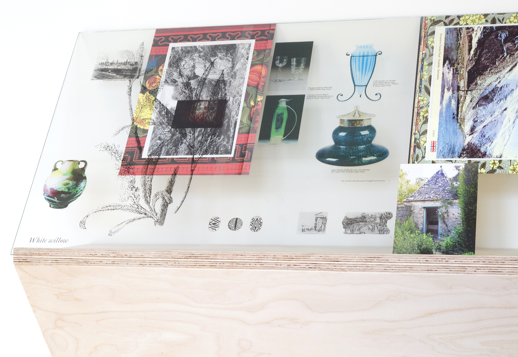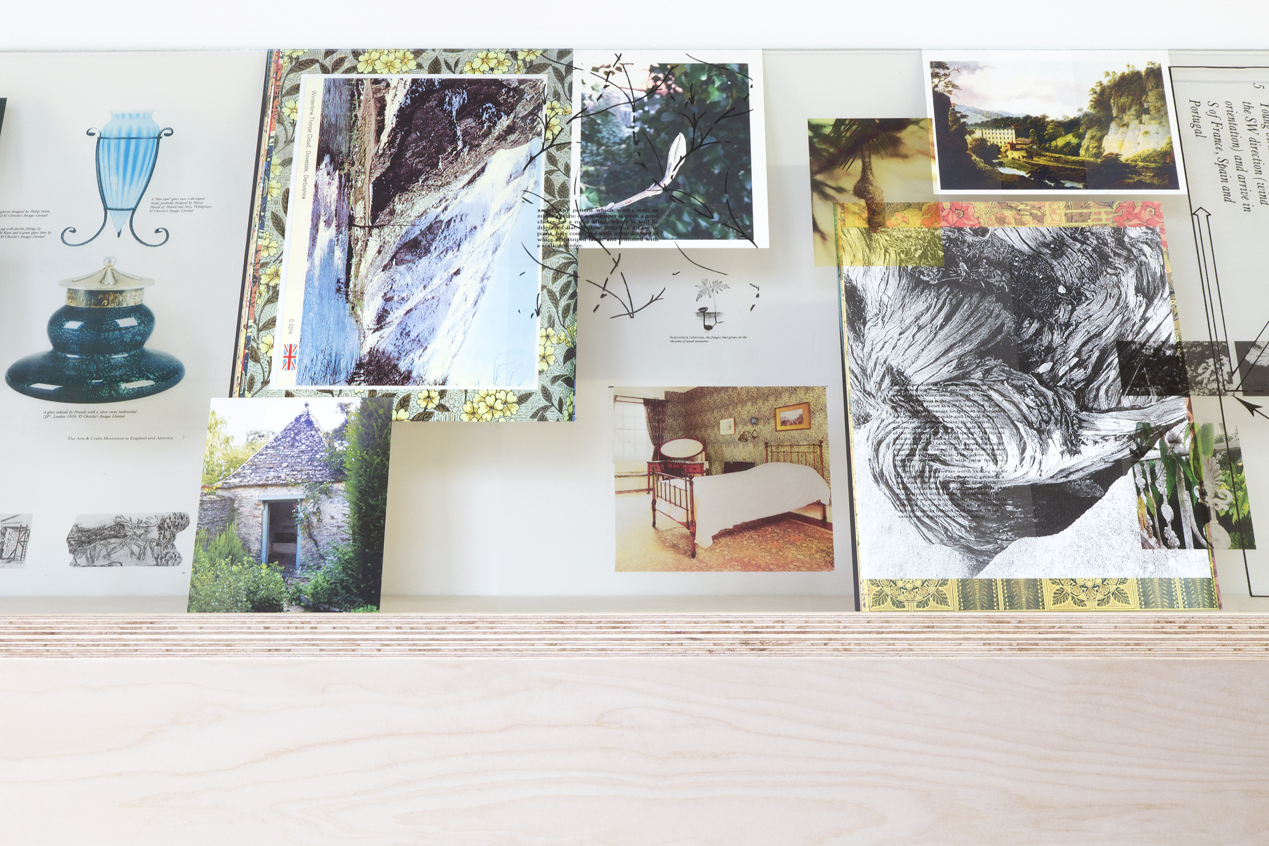 Wood shelf, glass, postcards, book pages, laser jet prints on acetate, 2018